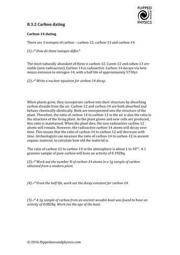 Decay two more two guys decay and so like everything in chemistry and a lot of what we're just trying to deal with in physics and quantum mechanics everything is probabilistic i mean maybe if we really got a detail on on the configurations of the nucleus maybe we could get it a. All carbon atoms contain six protons and six electrons, but the different isotopes have different numbers of neutrons. What is carbon dating in simple words / uses of radioactivity radiocarbon dating pass my exams easy exam revision notes for gsce physics : Other forms of radioactive dating are more broadly applicable. In other words, things that were living. It is unstable, and scientists know that it radioactively decays by electron emission to nitrogen 14, with a half life of 5730 years. William baker answer carbon 14 (c14) is an isotope of carbon with 8 neutrons instead of the more common 6 neutrons. What is carbon dating and how does it work : Carbon dating radioactive carbon dating is a technique that allows scientists to determine the era in which a sample of biological material died. To understand an isotope, you need to know a little about the structure of atoms. Let's model radioactive decay to show how carbon. Why isn't carbon dating used to date fossils? Definition of carbon dating in the definitions.net dictionary.
